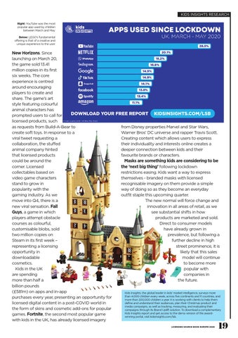 from Disney properties Marvel and Star Wars, Warner Bros’ DC universe and rapper Travis Scott. Creating content which allows users to express their individuality and interests online creates a deeper connection between kids and their favourite brands or characters. Masks are something kids are considering to be the ‘next big thing’ following lockdown restrictions easing. Kids want a way to express themselves - branded masks with licensed recognisable imagery on them provide a simple way of doing so as they become an everyday outfit staple this upcoming quarter. The new normal will force change and innovation in all areas of retail, as we see substantial shifts in how products are marketed and sold. Direct to consumer models have already grown in prevalence, but following a further decline in high street prominence, it is likely that this sales model will continue to become more popular with companies in the future. Kids Insights, the global leader in kids’ market intelligence, surveys more than 4,000 children every week, across five continents and 11 countries, and more than 200,000 children a year. It is working with clients to help them define and understand their audiences, plan their Christmas product and media campaigns, as well as tracking, measuring, and evaluating their campaigns through its Brand Uplift solution. To download a complementary Kids Insights report and get access to the demo version of the awardwinning portal, visit kidsinsights.com/lsb.