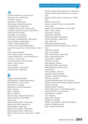 Batman: Arkham City: Video Game 2 - Warner Bros Batman: Arkham Knight: Video Game 4- Warner Bros Batman: Arkham Origins: Video Game 3 - Warner Bros Batman - Warner Bros Batman v Superman: Dawn of Justice (2016) Warner Bros Batman, The: Animated Series - Warner Bros Beano - Beano Studios Beach Boys - Bravado Beastie Boys - Bravado Beetle Juice (1988) - Warner Bros Ben 10 Alien Force - Warner Bros Best - Hearst UK Betty Boop - Bulldog Licensing Big Bang Theory, The: Television Series - Warner Bros Billie Eilish - Bravado Bing - Acamar Films Birds of Prey (2020) - Warner Bros Bjork - Global Merchandising Black Crowes - Bravado Blackpink - Bravado Black Sabbath - Bravado Black Adam (2021) - Warner Bros Black Lightning: Television Series Warner Bros Black Veil Brides - Bravado Bleed From Within - Bravado Blossoms - Global Merchandising Blue Note - Bravado Bouffants & Broken Hearts - Start Licensing Boy Girl Dog Cat Mouse Cheese - Bulldog Licensing Boyzone - Bravado Brandon Flowers - Bravado Bring Me The Horizon - Global Merchandising Britvic Soft Drinks - Start Licensing Brockhampton - Bravado Bros - Bravado Bryson Tiller - Bravado Buckcherry - Bravado Bullet For My Valentine - Global Merchandising Bullseye - Bulldog Licensing Bush - Global Merchandising