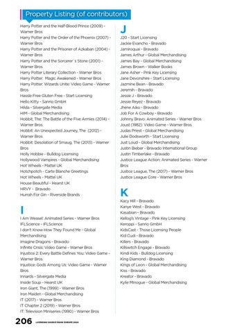 Property Listing (of contributors) Harry Potter and the Half-Blood Prince (2009) Warner Bros Harry Potter and the Order of the Phoenix (2007) Warner Bros Harry Potter and the Prisoner of Azkaban (2004) Warner Bros Harry Potter and the Sorcerer`s Stone (2001) Warner Bros Harry Potter Literary Collection - Warner Bros Harry Potter: Magic Awakened - Warner Bros Harry Potter: Wizards Unite: Video Game - Warner Bros Hassle Free Gluten Free - Start Licensing Hello Kitty - Sanrio GmbH Hilda - Silvergate Media HIM - Global Merchandising Hobbit, The: The Battle of the Five Armies (2014) Warner Bros Hobbit: An Unexpected Journey, The (2012) Warner Bros Hobbit: Desolation of Smaug, The (2013) - Warner Bros Holly Hobbie - Bulldog Licensing Hollywood Vampires - Global Merchandising Hot Wheels - Mattel UK Hotchpotch - Carte Blanche Greetings Hot Wheels - Mattel UK House Beautiful - Hearst UK HRVY - Bravado Hurrah For GIn - Riverside Brands