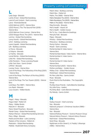 Match Attax - Bulldog Licensing Match Box - Mattel UK Matrix, The (1999) - Warner Bros Matrix Reloaded, The (2003) - Warner Bros Matrix Revolutions, The (2003) - Warner Bros Matrix 4, The (2022) - Warner Bros Meg Donnelly - Bravado Men’s Health - Hearst UK Men’s Health - Golden Goose Me To You - Carte Blanche Greetings Mercyful Fate - Bravado Migos - Bravado Ministry - Global Merchandising Miraculous - Bulldog Licensing Monty Python - Bravado Morph - Start Licensing Mortal Kombat 9: Video Game Warner Bros Mortal Kombat Klassic: Video Game - Warner Bros Mortal Kombat X: Video Game Warner Bros Mortal Kombat XI: Video Game Warner Bros Mortal Kombat (2021) - Warner Bros Mother and Baby - Golden Goose Mötley Crüe - Global Merchandising Motörhead - Global Merchandising Mr. Men Little Miss - Sanrio GmbH Muse - Bravado Mush-Mush & the Mushables - The Copyrights Group My Blue Nose Friends - Carte Blanche Greetings My Little Pony - Hasbro My Dinky Bear - Carte Blanche Greetings My Melody - Sanrio GmbH