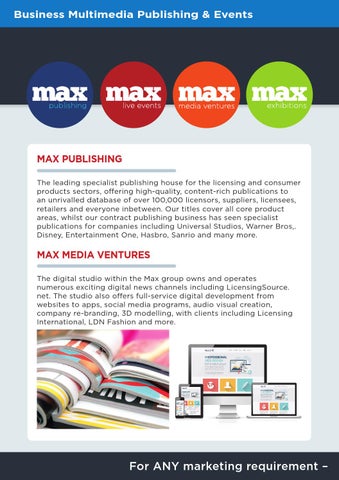 MAX PUBLISHING The leading specialist publishing house for the licensing and consumer products sectors, offering high-quality, content-rich publications to an unrivalled database of over 100,000 licensors, suppliers, licensees, retailers and everyone inbetween. Our titles cover all core product areas, whilst our contract publishing business has seen specialist publications for companies including Universal Studios, Warner Bros,. Disney, Entertainment One, Hasbro, Sanrio and many more.