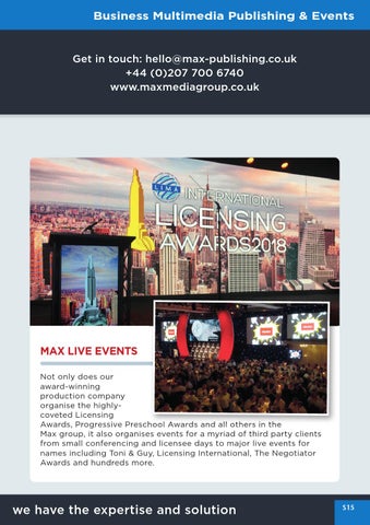 MAX LIVE EVENTS Not only does our award-winning production company organise the highlycoveted Licensing Awards, Progressive Preschool Awards and all others in the Max group, it also organises events for a myriad of third party clients from small conferencing and licensee days to major live events for names including Toni & Guy, Licensing International, The Negotiator Awards and hundreds more.