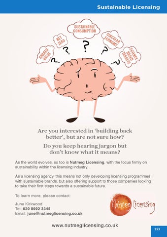 Are you interested in ‘building back better’, but are not sure how? Do you keep hearing jargon but don’t know what it means? As the world evolves, so too is Nutmeg Licensing, with the focus firmly on sustainability within the licensing industry. As a licensing agency, this means not only developing licensing programmes with sustainable brands, but also offering support to those companies looking to take their first steps towards a sustainable future. To learn more, please contact: June Kirkwood Tel: 020 8992 3345 Email: june@nutmeglicensing.co.uk