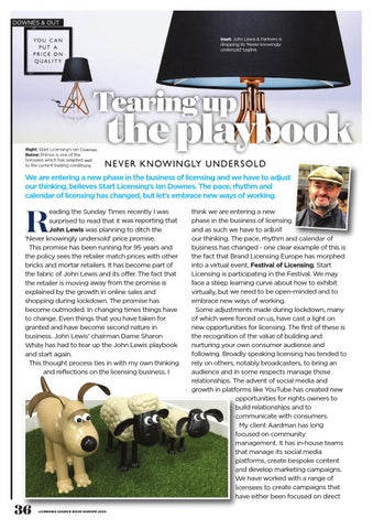 eading the Sunday Times recently I was surprised to read that it was reporting that John Lewis was planning to ditch the 'Never knowingly undersold' price promise. This promise has been running for 95 years and the policy sees the retailer match prices with other bricks and mortar retailers. It has become part of the fabric of John Lewis and its offer. The fact that the retailer is moving away from the promise is explained by the growth in online sales and shopping during lockdown. The promise has become outmoded. In changing times things have to change. Even things that you have taken for granted and have become second nature in business. John Lewis' chairman Dame Sharon White has had to tear up the John Lewis playbook and start again. This thought process ties in with my own thinking and reflections on the licensing business. I