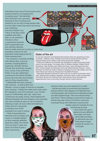 International was one of the licensees which quickly pivoted on recognising the increasing need. “We identified early that there was a growing demand for face coverings and wanted to do our part to keep people safe… Inset: Museums & Galleries has been inspired by key but that didn’t mean they had to be boring,” artworks, while Bravado is supporting the music says marketing community with its executive, Robert Ling. face coverings. “Many of the face masks available were fairly plain, so we wanted to introduce a face covering that would be both recognisable and eye catching, allowing them to really stand out in-store or online thus providing a chance for selfexpression while staying safe for State of the art those wearing them.” It’s not just character and entertainment brands which are appearing on face The company is currently working coverings – lifestyle, music, heritage and museum brands are also proving popular thanks to the variety of eye-catching artwork available. with Warner Bros. across its Museums & Galleries, for example, has developed a range showcasing major portfolio, including Batman, works of art and design. The range offers 12 different designs: William Morris’ Superman, Wonder Woman, Strawberry Thief, Edward Lear’s Birds and Owen Jones’ Moresque from the V&A; mineral designs and dinosaurs from the Natural History Museum; Turner, Friends, Rick and Morty, ScoobyMondrian and Norman Adam’s Rainbow Painting from the Tate Gallery; and The Doo, Looney Tunes and Harry Great Wave and Cranes by Hokusai from the British Museum. Potter. It has also added face Meanwhile, Bravado launched its ‘We’ve Got You Covered’ ecommerce site in April, offerings fans reusable, washable, cloth face masks, made in partnership coverings for the Steven Rhodes with artists across the Universal Music Group family. All net proceeds are licence, plus Pac Man and remains supporting the music community through various charity partners. open to future opportunities. TruffleShuffle has been working with Pyramid – as well as BWI and welcome when you can’t express it in a smile.” Difuzed – across a range of licences on reusable Just like any trend, no one knows how long-term face coverings. “Initially the masks went crazy when business will be in the category. For MaskClub, face the regulations were first imposed,” Lucy Cornish, covering designs will continue to be refreshed, just like buyer at TruffleShuffle, tells LSB. “Sales have any other apparel range. “We move with the times,” continued to be pretty strong. I think keeping the says Trevor. “We’re working on packs of five masks, so offering refreshed with new designs is key as people one for every day in terms of school or work, plus may have stocked up early on out of necessity. coverings that go with Halloween costumes and Wearing a mask can look a little intimidating to holiday masks for example. It’s now others and isn’t necessarily just business as usual. something most of the “I don’t think next year is population are used to seeing. going to be any different “I think incorporating fun from right now, there elements such as slogans and will be ebbs and flows wacky or nostalgic designs [in demand] sure, but I on face coverings definitely think there’s at least eases this a little. The Friends’ another 18 months,” he ‘How you Doin’?’ mask was concludes. genius as it kind of gives a warm (and funny) Inset: Pyramid is working with WBCP across its portfolio including Scooby-Doo and Friends.