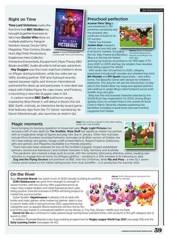 strength to strength. Busy Riverside Brands has spent much of 2020 steadily building its portfolio. ZURU Rainbocorns has gone from strength to strength in recent months, with the core toy offer supported across all major mass market retailers and initial licensed product sales being positive. Over ten licensees in EMEA will bring product to market this autumn/winter. Cyber Studios’ Gigantosaurus is already a hit at retail with books and video games, while master toy partner Jakks is due to launch trade wide in spring/summer 2021, supported by key categories such as apparel. Brand awareness will also rise by the end of this year thanks to a broadcast platform across Disney Jr, Tiny Pop, Disney+, Netflix and YouTube. Hurrah for Gin also continues to make parents laugh during these turbulent times, with products in the gift category due to launch in 2021. In addition, Riverside Brands is also busy building programmes for Rugby League World Cup 2021 (see page 108) and the Early Learning Centre (see pages 42-43).