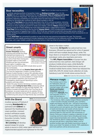 Street smarts As UK and Eire agent for Sesame Workshop, Bulldog Licensing will include the mega entertainment brand on its virtual booth at Festival of Licensing. Above: Sesame Workshop As well as Posh Paws having pancreated a global initiative European rights to new plush, called Caring for Each Other Whitehouse also has amusement as the pandemic unfolded. plush rights. In addition, new product launches through 2021 include dress-up and new homewares. On broadcast kids will see Sesame Street spin-offs on Tiny Pop this September. Cookie’s Crumby Pictures features Cookie Monster in various film parodies where he uses executive functioning skills - patience, focusing and memorisation - to solve problems. In Super Grover 2.0, the resident superhero uses his powers of investigating, observing and reporting to solve problems and help others. Earlier this year, Sesame Workshop created a global initiative called Caring for Each Other, producing critical public health messages for kids and their families. The initiative included animated PSAs that Tiny Pop ran on broadcast, via social media and on its website. Elmo’s Playdate also debuted, keying off the ubiquity of video conferencing and using it to help friends stay connected.