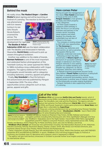 Having brought the management of the classic Peter Rabbit brand back in-house at the end of 2019, Penguin Ventures is now growing the baby and infant property in key categories. As Peter heads towards a milestone 120th birthday in 2022, the focus is on securing licensees and partners in the nursery sector, including travel systems and infant feeding. Eco-friendly and sustainable toys are also of interest to the team. The company is looking ahead to 2021 with new opportunities for The Snowman in secondary toy, stationery and food sectors, as well as growing the apparel offering into nightwear, underwear and socks. Following on from the 40th anniversary of Where’s Spot? and the launch of successful clothing ranges in Sainsbury’s and Tesco, Above: Peter Rabbit Penguin Ventures is now seeking is heading towards partners for toddler bedding and his 120th birthday broader toy categories, as well as in 2022. partyware, stationery and crafting. A lifestyle licensing programme around Cecily Mary Barker’s Flower Fairies illustrations is being built. The team is seeking partners in the female apparel, accessories and jewellery sectors. Picnic and partyware is another area of interest, capitalising on the botanically accurate original illustrations. Penguin Ventures is also supporting Festival of Licensing.