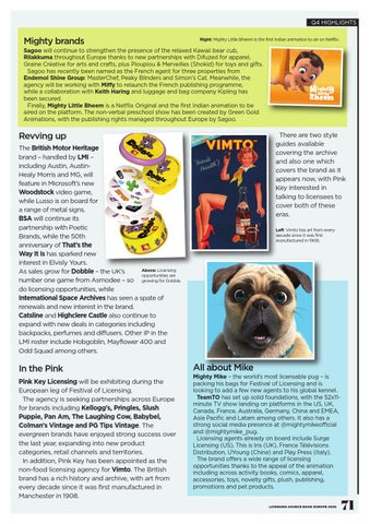 The British Motor Heritage brand – handled by LMI – including Austin, AustinHealy Morris and MG, will feature in Microsoft’s new Woodstock video game, while Lusso is on board for a range of metal signs. BSA will continue its partnership with Poetic Brands, while the 50th anniversary of That’s the Way It Is has sparked new interest in Elvisly Yours. Above: Licensing As sales grow for Dobble – the UK’s opportunities are number one game from Asmodee – so growing for Dobble. do licensing opportunities, while International Space Archives has seen a spate of renewals and new interest in the brand. Catsline and Highclere Castle also continue to expand with new deals in categories including backpacks, perfumes and diffusers. Other IP in the LMI roster include Hobgoblin, Mayflower 400 and Odd Squad among others.