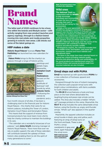 HRP makes a date Historic Royal Palaces’ licensee Flame Tree Publishing has launched two new calendars for 2021. Palace Prints brings to life the charity’s six palaces through a range of historic prints, paintings and details maps. Meanwhile, Hampton Court Palace Masterpieces focuses on the palace’s multitude of ‘baroque’ wall murals by artist, Antonio Verrio. Following the Above: Palace Prints is one of a brace of COVID-19 calendar offerings from Flame Tree. pandemic and a four-month closure of all sites, it has been a challenging start to the financial year for Historic Royal Palaces – the charity that cares for six historic palaces, including the Tower of London, Hampton Court Palace and Kensington Palace. This means that the support of revenue from licensed products has never been more vital to help the charity continue to maintain the buildings in its care. “The calendars are a wonderful showcase of our palaces,” said Jenny Smyth, licensing manager at Historic Royal Palaces. “Now more than ever we rely on public support, the sale of these calendars will contribute towards the upkeep of these historic sites enabling them to stir the spirit of many generations to come.”