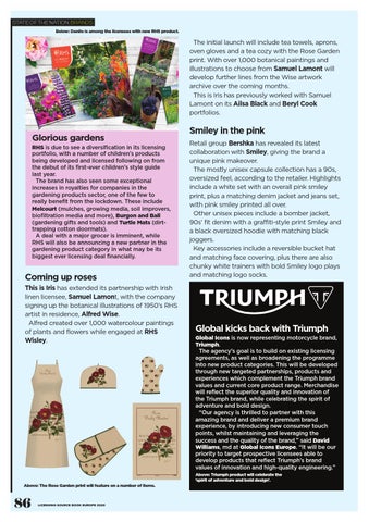 Glorious gardens RHS is due to see a diversification in its licensing portfolio, with a number of children’s products being developed and licensed following on from the debut of its first-ever children’s style guide last year. The brand has also seen some exceptional increases in royalties for companies in the gardening products sector, one of the few to really benefit from the lockdown. These include Melcourt (mulches, growing media, soil improvers, biofiltration media and more), Burgon and Ball (gardening gifts and tools) and Turtle Mats (dirttrapping cotton doormats). A deal with a major grocer is imminent, while RHS will also be announcing a new partner in the gardening product category in what may be its biggest ever licensing deal financially.