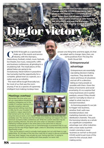 Entrepreneurs are essentially risk-taking decision-making machines. They decide the vision and focus of a business and set off in a direction, taking as many people as possible with them. Given the status of economic and social uncertainty, it’s no surprise that many businesses are in partial paralysis, unsure if they should Meetings overhaul wait for normality to return or Remember the time when you adapt to what may be a set up a speculative introductory meeting, schlepping out to the transient transition. middle of nowhere, signing in to a As licensing people it’s our job desolate reception area and to trigger new business, being served nothing more than a milky tea for your troubles? All whether that’s with new to explore a vague opportunity branded product, new that turned out to be, at best, a marketing channels or new long shot and, at worst, a non-starter? Well, fortunately for you those days are distribution channels. This puts probably over. The chances are that introductory meetings will happen first and foremost via teams/video conference call. While the current rationale may be the licensing industry as a whole about avoiding infection, the time will come when no rationale is needed. at a significant competitive Gathering multiple people in the same place at the same time to discuss advantage over other industries something uncertain is going to be so overwhelmingly inconvenient that it’s not going to be the way things happen again, unless it’s absolutely necessary and the with a more static business opportunity is real. model. Licensing is never Sure, you’re going to want to actually meet people, but not until there is a real relationship. So, the days of the two-hour road trip to Leeds to discuss something ‘business as normal’ so the postCOVID world is just more of the that may never happen may actually be over. Having said that, I’m going to Liverpool next month for a meeting with three people I’ve never met! same for this unusual, dealmaking sector.