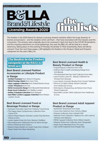 finalists The finalists in the 2020 Brand & Lifestyle Licensing Awards certainly reflect the huge diversity of brands and products – and the retailers which sell them - that have resonated with the industry and the consumers. The winners were originally due to be crowned in April, but due to the COVID-19 pandemic and the ongoing restrictions on social gatherings, this year the B&LLAs will be held as a virtual ceremony, taking place on the evening of Monday November 9. Most importantly, there will still be winners!’ Over the next three pages, LSB highlights the finalists in the Product, Retail and Property categories for this year’s B&LLAs.