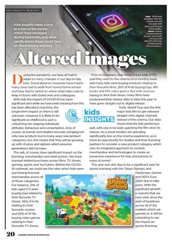 uring the pandemic, we have all had to adapt to many changes in our day-to-day lives. Social distance measures have meant many have had to work from home/home-school and have had to switch to online chat/video calls to keep in touch with loved ones and colleagues. With kids the impact of COVID-19 has been significant and while we have been tracking how this has been affected in real-time, the longer term impact on them is still unknown. However, it is likely to be significant as childhood is such a critical time for shaping individuals attitudes, behaviour and consumption. And, of course, as brands and retailers innovate, bringing not only new products but in many ways new product categories, too, this means that they will be growing up with choices and options which previous generations did not have. This will, of course, have significant impact on the licensing, merchandise and retail sectors. We track licensed related purchases across films, TV shows, gaming, sports and YouTubers. Before the COVID19 outbreak, we could see the rates which kids were purchasing licensed merchandise across all of those categories. For instance, 31% of kids aged 3-5 were buying toys related to their favourite TV shows, 26% of 6-9s relating to their favourite movies and 20% of 13-15s buying video games relating to their favourite TV shows.