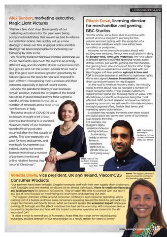 “Our partners have been fantastic. Despite having to deal with their own supply chain challenges, staff furloughs and new market conditions on an almost daily basis, I have to credit our licensees and retail partners for being so responsive. They’ve taken the time to connect with our teams and are at once focused on maximising the short-term and planning out 2021. The biggest unknown will be around consumer confidence and consumer spending. We’re coming out of a bubble and have seen consumers queueing around the block to get back into shops like Primark and Sports Direct. What we haven’t seen is the economic impact of people coming off furlough and the effect lockdown has had on the economy. Will consumers feel as buoyant by September and how will this impact consumer spend as we move into the allimportant Q4? It takes a crisis to remind you of humanity. I hope that the things we’ve valued during lockdown, and the strength of our relationships as a result, remain for years to come.”