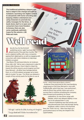 home - which have gone down a storm.” Andersen Press launched its first merchandising range based on Not Now, Bernard in June with TruffleShuffle, which Paul says “over-performed”, while its Elmer Day activity online was such a success that it could be something the company takes forward post-pandemic for future celebrations. Its new Elmer range with Matalan, which was delayed slightly, is now due to be released later in July. Usborne Publishing says that activity and educational books have sold strongly during lockdown, while, in terms of its licensed lines, the ‘That’s not my…’ titles have kept up a good performance as many are ranged in the supermarkets.