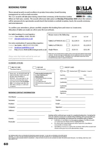 BOOKING FORM These annual awards reward excellence in product innovation, brand licensing management as well as retail execution. The 2020 awards will take place during a lunch time ceremony at the luxurious London Hilton on Park Lane, London. The awards afternoon takes place on Monday 9 November 2020 where the winners will be announced at a spectacular awards lunch that includes a cocktail reception, lunch, the awards ceremony and entertainment. To confirm your attendance, please carefully complete this booking form and return to Createvents. Allocation of tables are made on a first come first served basis. For table bookings & event logistics: Contact: Clare Hollick, 01183 340085 Email: clare@createvents.co.uk