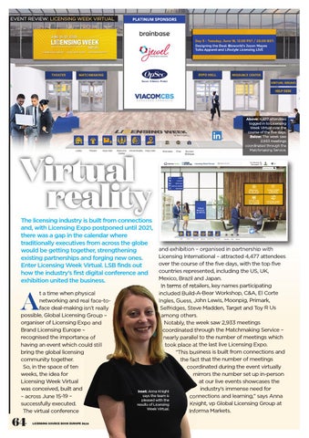 t a time when physical networking and real face-toface deal-making isn’t really possible, Global Licensing Group – organiser of Licensing Expo and Brand Licensing Europe – recognised the importance of having an event which could still bring the global licensing community together. So, in the space of ten weeks, the idea for Licensing Week Virtual was conceived, built and – across June 15-19 – successfully executed. The virtual conference