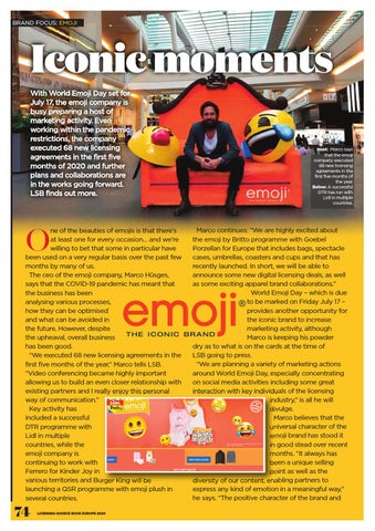 ne of the beauties of emojis is that there’s at least one for every occasion… and we’re willing to bet that some in particular have been used on a very regular basis over the past few months by many of us. The ceo of the emoji company, Marco Hüsges, says that the COVID-19 pandemic has meant that the business has been analysing various processes, how they can be optimised and what can be avoided in the future. However, despite the upheaval, overall business has been good. “We executed 68 new licensing agreements in the first five months of the year,” Marco tells LSB. “Video conferencing became highly important allowing us to build an even closer relationship with existing partners and I really enjoy this personal way of communication.” Key activity has included a successful DTR programme with Lidl in multiple countries, while the emoji company is continuing to work with Ferrero for Kinder Joy in various territories and Burger King will be launching a QSR programme with emoji plush in several countries.