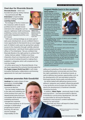 Deal duo for Riverside Brands Riverside Brands – which was founded last year by Ashley Holman – has partnered with The Entertainer to lead its brand extension strategy for Early Learning Centre. The heritage of the ELC brand and the characters within its brand portfolio lend it to wider brand extensions into categories such as Ashley apparel, nightwear, health and beauty, Above: Holman’s Riverside Brands has secured publishing, nursery and experiences, deals for Early particularly Happyland and the core Learning Centre and RLWC 2021. ELC brand. “With such a strong heritage as an iconic part of early years development, we are confident there is more opportunity for the brand to be an even bigger part of children’s early years by giving them greater access to the characters through carefully selected brand extensions,” said Stuart Grant, global sourcing officer of The Entertainer. “We are confident that Riverside Brands is the right partner to achieve this.” Ashley Holman added: “Children love these characters, they’re an important part of their early years and we’re looking forward to making them available in categories which will complement the core toy ranges.” In further good news for Riverside Brands, it has also been appointed the exclusive licensing agent for the Rugby League World Cup 2021. It will create innovative third-party collaborations and licensing agreements for next year’s tournament.