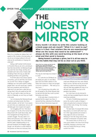Every month I sit down to write this column looking at a blank page and ask myself: “What it is I want to say? What is it that I feel retailers like me are experiencing? What are the issues that need to be addressed?” I always do this with one word burning at the back of my mind and that word is honesty. Being honest is perhaps a given, but it is all too easy to slip into habits that may not be as clear cut as you think. Above: Don’t be a monkey, just look into the honesty mirror urges David Robertson. Right: Realising that there are others in the same boat as you, provides some comfort and helps you to face up to your challenges. Below: It is now over two years since Boris Johnson told us all to stay at home.