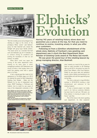 Above: PG’s Jakki Brown (third left) with Retas’ winners (far left-right) Bentleys’ Stephen and Julie McHale with Beverley Yates and The Beverley Card Company’s Donna Stocks (second right). Left: Alan Bushnell, group md of Elphicks was happy to show PG’s Jakki Brown around the new look greeting card department of this Retas award winning store. Below left: Danilo’s Daniel Prince (left) and PG’s Warren Lomax were among the Cardgains Lookout London Charity Challengers who were applauded on stage at The Retas for their efforts, with half the raffle money at the event going to MNDA, meaning almost £49k has now been raised.