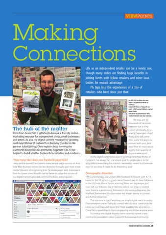 The hub of the matter Chris Fox’s brainchild is giftshophub.co.uk, a friendly online marketing resource for independent shops, small businesses and artists. As also the digital content manager for greeting card shop Wishes of Cudworth in Barnsley (run by his life partner Julia Keeling), Chris explains how forming the Cudworth Businesses & Community Together (CBCT) has helped to build a better Cudworth for retailers and residents. “How many ‘likes’ does your Facebook page have? I only ask the question as it seems many people judge success on their total ‘likes’. Business owners can be distracted trying to gain more social media followers while ignoring their Facebook pages’ daily interactions from its current ones. Would it not be better to judge the success of our digital marketing by daily comments, shares and enquires?