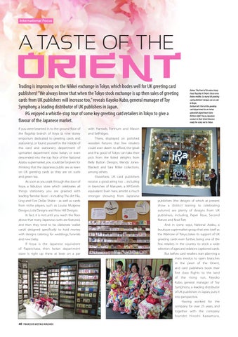 A TASTE OF THE Trading is improving on the Nikkei exchange in Tokyo, which bodes well for UK greeting card publishers! “We always know that when the Tokyo stock exchange is up then sales of greeting cards from UK publishers will increase too,” reveals Kayoko Kubo, general manager of Toy Symphony, a leading distributor of UK publishers in Japan. PG enjoyed a whistle-stop tour of some key greeting card retailers in Tokyo to give a flavour of the Japanese market. If you were beamed in to the ground floor of the flagship branch of Itoya (a nine storey emporium dedicated to greeting cards and stationery), or found yourself in the middle of the card and stationery department of upmarket department store Isetan, or even descended into the top floor of the National Azabu supermarket, you could be forgiven for thinking that the Japanese public are as keen on UK greeting cards as they are on sushi and green tea. As soon as you walk through the door of Itoya, a fabulous store which celebrates all things stationery, you are greeted with leading ‘familiar faces’ - including The Art File, Ling and Five Dollar Shake - as well as cards from niche players, such as Louise Mulgrew Designs, Lola Designs and Rose Hill Designs. In fact, it is not until you reach the floor above that many Japanese cards are featured, and then they tend to be elaborate ‘wallet cards’ designed specifically to hold money with designs catering for weddings, funerals and new baby. If Itoya is the Japanese equivalent of Paperchase, then Isetan department store is right up there at least on a par