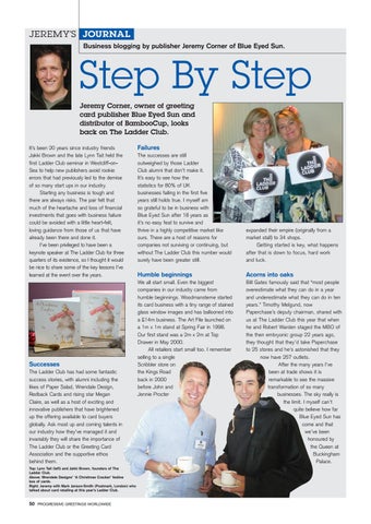 Step By Step Jeremy Corner, owner of greeting card publisher Blue Eyed Sun and distributor of BambooCup, looks back on The Ladder Club. It’s been 20 years since industry friends Jakki Brown and the late Lynn Tait held the first Ladder Club seminar in Westcliff-onSea to help new publishers avoid rookie errors that had previously led to the demise of so many start ups in our industry. Starting any business is tough and there are always risks. The pair felt that much of the heartache and loss of financial investments that goes with business failure could be avoided with a little heart-felt, loving guidance from those of us that have already been there and done it. I’ve been privileged to have been a keynote speaker at The Ladder Club for three quarters of its existence, so I thought it would be nice to share some of the key lessons I’ve learned at the event over the years.
