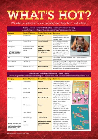 PG asked a selection of card retailers for their ‘hot’ card sellers. Rachel Loubser, owner of The Baobab, Mortimer Common, Reading A small shop in a village with a visitors and loyal locals customer base. Category