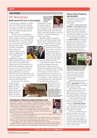 PR Bonanza Media spread the love of card sending In what has been something of a ‘purple patch’ on the PR front for the greeting card sector, TV programmes, newspapers, radio stations and news sites have been awash with positive coverage about the sending of cards. “We have seen an unprecedented amount of press interest and the resultant media coverage has all been very positive,” Amanda Fergusson, ceo of the GCA told PG. “What’s more, a lot of the coverage came in good time to encourage more Christmas card sending. Journalists contacted the GCA wanting some feelgood stories, and card sending is definitely one of those,” added Amanda. Among the PR highlights was the BBC 1’s A Very Country Christmas programme which starred card publisher Laura Stoddart as well as information from the GCA and Max Publishing’s Jakki Brown (who owns one of the first Christmas cards). Laura explained to journalist Angellica Bell that she had “sold Christmas cards every single week of the year, even through the summer” and also spoke the industry’s progress on the environmental footprint front. Christmas cards also featured extensively on an episode of BBC 1’s Britain’s Christmas Story, that was presented by Gareth Malone and Karen Gibson. As part of this, Karen visited the
