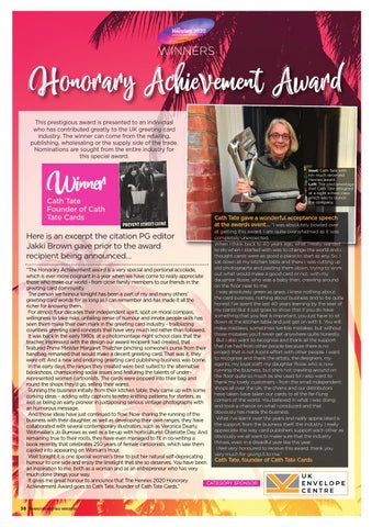 at getting this award. I am quite overwhelmed as it was completely unexpected. When I think back to 40 years ago, what I really wanted to do when I started with was to change the world and I thought cards were as good a place to start as any. So, I sat down at my kitchen table and there I was cutting up old photographs and pasting them down, trying to work out what would make a good card or not, with my daughter Rosie, who was a baby then, crawling around on the floor near to me. I was absolutely green as grass. I knew nothing about the card business, nothing about business and to be quite honest I’ve spent the last 40 years learning by the seat of my pants! But it just goes to show that if you do have something that you feel is important, you just have to sit down at the kitchen table and just get on with it. You will make mistakes, sometimes terrible mistakes, but without those mistakes you’ll never get anywhere quite honestly. But I also want to recognise and thank all the support that I’ve had from other people because there is no project that is not a joint effort with other people. I want to recognise and thank the artists, the designers, my agents, my loyal staff, my daughter Rosie who is now running the business, but she’s not crawling around on the floor quite so much as she used to! I also want to thank my lovely customers - from the small independent shops all over the UK, the chains and our distributors have taken have taken our cards to all the far-flung corners of the world. You believed in what I was doing and took a chance on what I produced and that obviously has made the business. What I’ve learnt over the years and really appreciated is the support from the business itself; the industry. I really appreciate the way card publishers support each other as obviously we all want to make sure that the industry thrives, even in a dreadful year like this year. I feel very honoured to receive this award, thank you very much for giving it to me.”