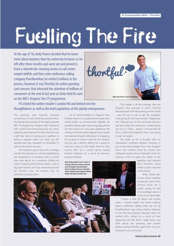 This makes it all the stranger that the Dragons’ Den episode in which Thortful featured starts with Andy being lost for words - was this just a ruse to get the sympathy votes going for this ‘boy wonder’? Apparently not. “They get you to the set at 6am and you are kept away from everyone. I ended being last on at 7.15pm - almost 13 hours later. By then, I really had forgotten what I was going to say,” he laughs. He made up for it though, with his subsequent confident delivery resulting in two investment pledges from two ‘Dragons’ (from the ‘vitamin king’ Tej Lalvani and ‘cashpoint queen’ Jenny Campbell) while not missing a trick to push the merits of the greeting card industry and Thortful’s place within it, both now and in the future. Andy clearly gets a buzz about building businesses (and then selling them for a profit), seeing his lack of knowledge about a sector as an advantage. “I knew a little bit about call centres when I started Inkfish, but knew nothing about conference calling when we set up PowWowNow,” says Andy, making reference to the last two business through which he netted £20+ million as a result of their respective sell offs. “And I really knew very little about the greeting card market before starting Thortful, apart from my own frustrations as a consumer.” PROGRESSIVE GREETINGS WORLDWIDE