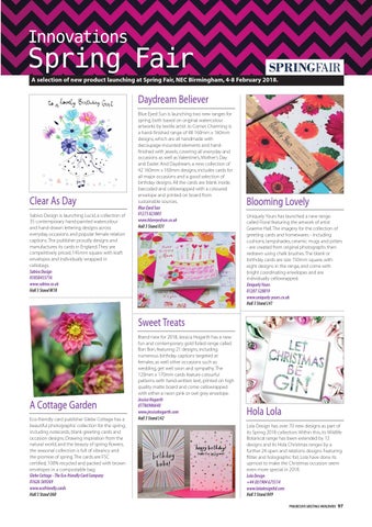 Clear As Day Sabivo Design is launching Lucid, a collection of 35 contemporary hand-painted watercolour and hand-drawn lettering designs across everyday, occasions and popular female relation captions. The publisher proudly designs and manufactures its cards in England. They are competitively priced, 145mm square with kraft envelopes and individually wrapped in cellobags. Sabivo Design 01858433716 www.sabivo.co.uk Hall 3 Stand W18