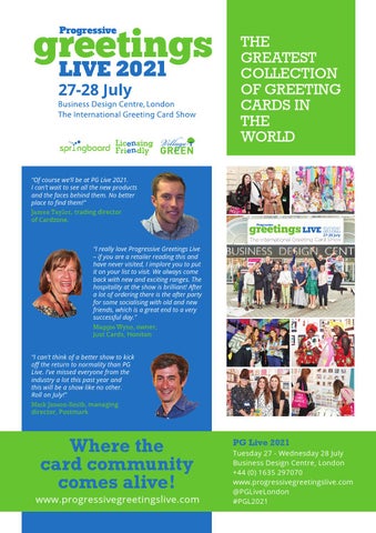 “I really love Progressive Greetings Live – if you are a retailer reading this and have never visited, I implore you to put it on your list to visit. We always come back with new and exciting ranges. The hospitality at the show is brilliant! After a lot of ordering there is the after party for some socialising with old and new friends, which is a great end to a very successful day.” Maggie Wynn, owner, Just Cards, Honiton “I can’t think of a better show to kick off the return to normality than PG Live. I’ve missed everyone from the industry a lot this past year and this will be a show like no other. Roll on July!” Mark Janson-Smith, managing director, Postmark