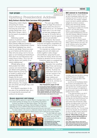 Uplifting Presidential Address Belly Button’s Rachel Hare becomes GCA president Safeguarding creative integrity and pushing the industry forward on the environmental front were two of the main priorities Rachel Hare, md of Belly Button Designs, cited in her first speech as president of the GCA. Addressing a packed audience of publishers, retailers and suppliers at last month’s GCA centenary AGM and Conference (which took place at Westminster’s Central Hall), Rachel highlighted how, when it comes to card design “Some icons never go out of fashion and the trends we all follow will come and go, but it is how we apply our own branding and handwriting to these which we must hold precious and respect those of others. This in turn will keep the vibrancy and creativity of our industry bubbling away.” Officially taking over as GCA president from UKG’s customer and channel director, Ceri Stirland at the gathering, Rachel shared her journey from art student to setting up and developing Belly Button Designs into the muchrespected design-led publisher which next year celebrates its 25th anniversary. The company also owns three card and gift shops under the same brand. As to Rachel’s expectations for the two years of her presidential reign, she is in no doubt that the environment will continue to be dominant.