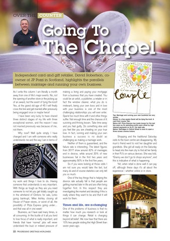 The Chapel Independent card and gift retailer, David Robertson, coowner of JP Pozzi in Scotland, highlights the parallels between marriage and running your own business. As I write this column I am literally a month away from one of life’s major events. No, not the opening of another store or the picking up of an award, but the event of tying the knot! Yes, at the grand old age of 45 I will finally cross the line and get married after previously being engaged once or maybe twice! I have been very lucky to have shared three distinct stages of my life with three exceptional women, and the reason I was not married previously was because of me, not them. Why now? Well quite simply I have changed and I am with someone who really understands me and the way I am in terms of