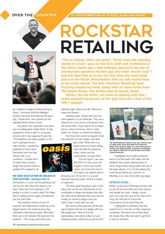 Rockstar Retailing “This is history…Well, not quite”. Those were the opening words of a talk I gave at the GCA AGM and Conference a few short weeks ago. I had willingly agreed to be one of the keynote speakers months ago, but what would I say? I had the idea that as it was the first time the event took place in the North (Manchester) that my talk would have to be music based. The title ‘Rockstar Retailing’ kept buzzing around my head, along with so many tunes from The Stone Roses, The Smiths and of course, Oasis. While I do not think I am even an ageing rock star, I really enjoyed being part of the gig! Here are a few of the riffs I ‘played’. As I walked on stage to Swamp Song by Oasis, I mimicked what the Gallagher brothers had done at Knebworth 25 years ago. I stood there, arms spread out and repeated Noel’s historic words. My speech was supposed to be about how an independent retailer thinks. It was supposed to shine a light on my buying process and it was supposed to give the 170 publishers and trade suppliers in the room a glimpse into an indie mindset. I wanted the publishers to think about themselves and how they interact with us as customers. I wanted them to realise that not every range they produce will be a greatest hit or appeal to all. WE NEED EACH OTHER WE BELIEVE IN ONE ANOTHER - Aquiesce Noel G Connections, in music and the greeting card industry are vital, they both require a fan base. Oasis went from playing to 100 people in a club in London called The Water Rats to selling out two nights at Knebworth just two years later. This relatively unknown bunch of chancers from Manchester ended up as the biggest band in the world because they cultivated a following and grew. With Oasis there was a link between the band and the audience. Their songs were about your 12