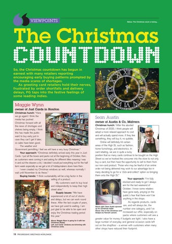 Sean Austin owner of Austin & Co, Malvern Christmas hunch: “After the aborted Christmas of 2020, I think people will adopt a more relaxed approach to cost and will actually spend more. If they like something, they will buy it, no quibble. Online will definitely hit certain areas of the High St, such as fashion, home furnishings, and electronics. In card retailing, we are in quite a lucky position that so many cards continue to be bought on the High Street so we've hooked the consumer into the store to not only buy a card, but then have the opportunity to sell to them from our non-card product. Those who may be fearful of an online order not being delivered may work to our advantage too in many deciding to go for a 'click-and-collect' option so bringing them onto the High St.” Your approach: “I'm fully stocked and ready to go! I always aim for the last weekend of October. I know some retailers have gone early, preying on the public's fear that there won't be anything in the shops. As regards products, cards are, and will always be, the Above right: Sean Austin aproned up for Christmas trade! number one category, and I’ve Above: One of the Christmas card increased our offer, especially on designs by Hannah Lawson. packs where customers will see a greater value for money if budgets are tight. I also have a large number of everyday and general occasion cards left out on the shopfloor - a winner with customers when many other shops have reduced their footprint.