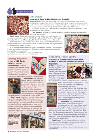 VIEWPOINTS Carl Dunne co-owner of Cards & Gifts Sheffield and Dronfield: Christmas hunch: “Having been out in shopping centres the last two weekends, following media warnings about shortages of toys etc. I think there's already a buying frenzy with people worried about supplies. It looks like customers aren't even wanting to risk waiting for online purchases to arrive and so are pushing themselves out into the high street to make sure they get what they want now. In our shops stock is moving a little faster than usual right now, but I wonder whether this is just a blip because of the media hysteria.” Your approach: “We put all our Christmas stock out at the start of September and have already seen strong seasonal sales.” Supply issues: “Supply issues have not been a major problem as a whole, as we buy from a wide spectrum of publishers. Having UKG, ICG, Cherry Orchard, Noel Tatt, Paper Salad, Nigel Quiney, Dean Morris, Second Nature, Carte Blanche, Words ‘n’ Wishes, we're well covered! Some supply houses have warned of and suffered delays, whereas others forecast issues and got ahead so we've had reasonable stocks to be able to continue to offer a good selection to customers despite delivery upheaval. In the end it will be the publishers that suffer if they deliver late, ultimately it may simply result in higher returns. Like others, we insist on 100% sale or return on seasonal goods, especially important if they've delivered late.” Above: There’s no mistaking that Christmas is coming at Cards & Gifts Sheffield. Right: Carl Dunne and his partner Ollie Guise-Smith at PG Live 2021.