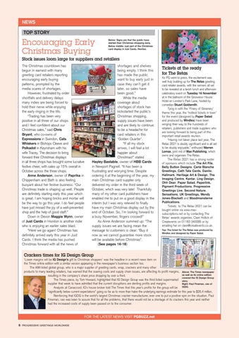 shortages and shelves being empty. I think this has made the public want to buy early just in case they can’t get it later, so sales have been good.” While the media coverage about shortages of stock has kickstarted the public’s Christmas shopping, supply issues have been and are likely to continue to be a headache for card retailers in this ‘Golden Quarter’. “If all my stock arrives, I will feel a lot happier about Christmas!” stated Hayley Bastable, owner of HBB Cards in Newport Pagnell. “It has been a frustrating and worrying time. Despite ordering it at the beginning of the year, my main Christmas card supplier only delivered my order in the third week of October, which was very late! Thankfully many of my other card publishers have enabled me to put on a good display in the interim but I was very relieved to finally have my main Christmas display out by the end of October. So, I’m looking forward to a busy November, fingers crossed!” As Anne Anderson summed up: “The supply issues we are facing mean the message to customers is clear: “Buy it now as we cannot guarantee more stock will be available before Christmas”. (See pages 16-18)