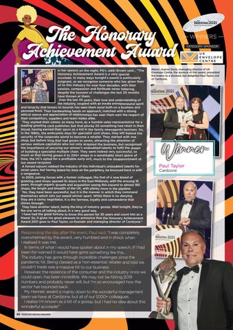Responding the day after the event, Paul said: “I was completely overwhelmed by the award…very humbled and in shock when I realised it was me. In terms of what I would have spoken about in my speech, if I had been for-warned it would have gone something like this… The industry has gone through incredible challenges since the pandemic hit. Being classed as a ‘non-essential’ retailer and told we couldn’t trade was a massive hit to our business. However, the resilience of the consumer and the industry. once we could open, has been incredible. We may not be hitting 2019 numbers and probably never will, but I’m so encouraged how the sector has bounced back. My Henries’ award is mainly down to the wonderful management team we have at Cardzone, but all of our 1,000+ colleagues. I realise I’m known as a bit of a gossip, but I had no idea about this wonderful accolade!” 60