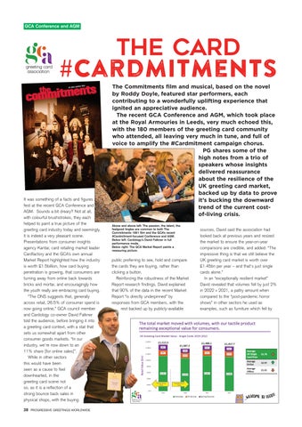 The Commitments film and musical, based on the novel by Roddy Doyle, featured star performers, each contributing to a wonderfully uplifting experience that ignited an appreciative audience. The recent GCA Conference and AGM, which took place at the Royal Armouries in Leeds, very much echoed this, with the 180 members of the greeting card community who attended, all leaving very much in tune, and full of voice to amplify the #Cardmitment campaign chorus. PG shares some of the high notes from a trio of speakers whose insights delivered reassurance about the resilience of the UK greeting card market, backed up by data to prove it’s bucking the downward trend of the current costof-living crisis.