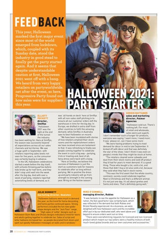FEEDBACK This year, Halloween marked the first major event since most of the world emerged from lockdown, which, coupled with its Sunday date, stood the industry in good stead to finally get the party started again. And it seems that despite understandable caution at first, Halloween 2021 went off with a bang. We heard from very happy retailers on partyworldwide. net after the event, so here, Progressive Party found out how sales were for suppliers this year. ELLIOTT PECKETT director, Smiffys