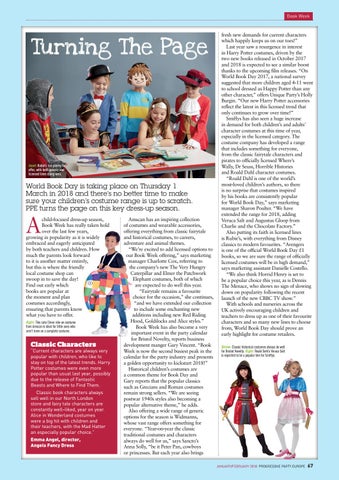 fresh new demands for current characters which happily keeps us on our toes!” Last year saw a resurgence in interest in Harry Potter costumes, driven by the two new books released in October 2017 and 2018 is expected to see a similar boost thanks to the upcoming film releases. “On World Book Day 2017, a national survey suggested that more children aged 4-11 went to school dressed as Happy Potter than any other character,” offers Unique Party’s Holly Burgin. “Our new Harry Potter accessories reflect the latest in this licensed trend that only continues to grow over time!” Smiffys has also seen a huge increase in demand for both children’s and adults’ character costumes at this time of year, especially in the licensed category. The costume company has developed a range that includes something for everyone, from the classic fairytale characters and pirates to officially licensed Where’s Wally, Dr Seuss, Horrible Histories and Roald Dahl character costumes. “Roald Dahl is one of the world’s most-loved children’s authors, so there is no surprise that costumes inspired by his books are consistently popular for World Book Day,” says marketing manager Sharon Poulter. “We have extended the range for 2018, adding Veruca Salt and Augustus Gloop from Charlie and the Chocolate Factory.” Also putting its faith in licensed lines is Rubie’s, with everything from Disney classics to modern favourites. “Avengers is one of the official World Book Day £1 books, so we are sure the range of officially licensed costumes will be in high demand,” says marketing assistant Danielle Costello. “We also think Horrid Henry is set to be a popular choice this year, as is Dennis The Menace, who shows no sign of slowing down on popularity following the recent launch of the new CBBC TV show.” With schools and nurseries across the UK actively encouraging children and teachers to dress up as one of their favourite characters and so many new lines to choose from, World Book Day should prove an early highlight for costume retailers. Below: Classic historical costumes always do well for Bristol Novelty. Right: Roald Dahl’s Veruca Salt is expected to be a popular line for Smiffys.