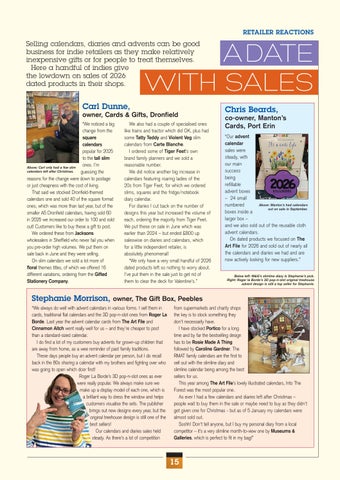 “We always do well with advent calendars in various forms. I sell them in cards, traditional flat calendars and the 3D pop-n-slot ones from Roger La Borde. Last year the advent calendar cards from The Art File and Cinnamon Aitch went really well for us – and they’re cheaper to post than a standard-sized calendar.