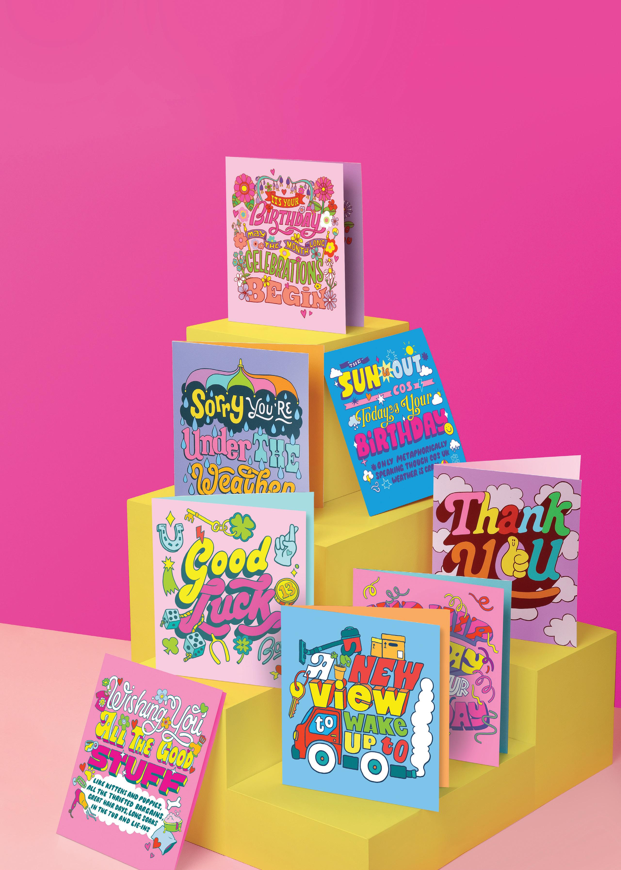 Living in the city is a massive influence on my work and I’m very much drawn to all the vibrance, sights and signage that city living brings - you can really see this in our NEW greeting card collection, which is lettering-based and speaks to folks looking for celebratory cards that are totally joyful bursts of colour too!