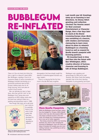 Left: Longstanding WHS/now TGJones’ card buyer (centre) Claire Castle, recipient of The Henries Honorary Achievement award at the event with colleague Sharon Fox (left) and PG’s Jakki Brown. Below left: Bubblegum’s set for a comeback. UKG’s Ben Whittington, Louise James (right) with PG’s Jakki Brown at the recent BLE show. (See pages 72-73)