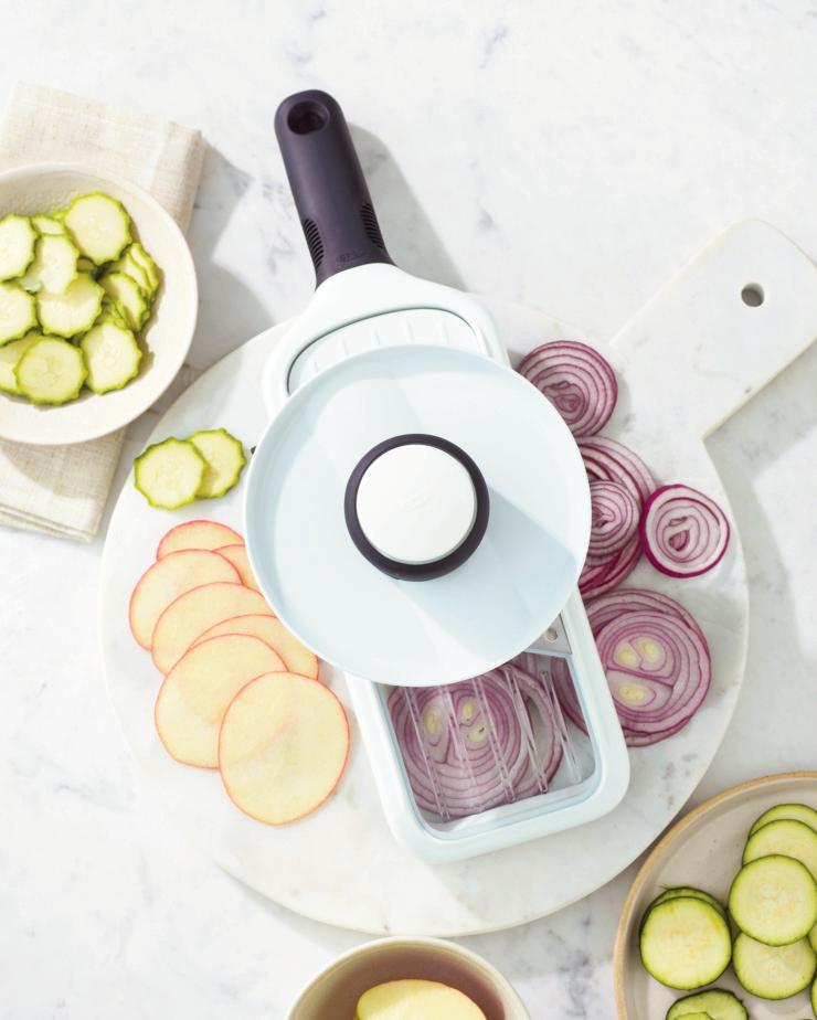 Meet the ultimate space-saving slicer for modern kitchens. This compact mandoline offers the precision of a full-size model in a smaller version, with 1,2,3 and 6mm thickness settings and built-in julienne blades. The easyturn dial makes adjusting thickness settings effortless, while the automatic food holder ensures even cuts and keeps fingers safe. With its angled, non-slip handle and stable base, it’s the ultimate companion for batch cooking or for anyone who wants professional-quality prep without the bulk in their kitchen cupboards.