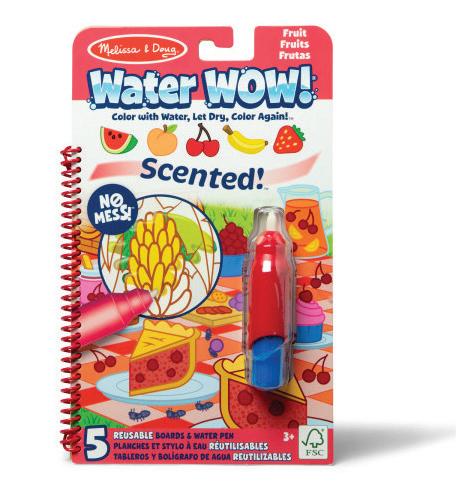 No-mess Water WOW! Painting for kids now smells delicious! This exciting scented paint-with-water colouring book includes five reusable pages and a refillable water pen. Use the pen to colour in each scene and scents, details and vibrant colours appear with every stroke! The chunky-sized water pen is easy to hold and stores neatly right on the front cover, making this scented Water WOW! an ideal activity book and travel toy for kids. service@melissaanddoug.com www.melissaanddoug.co.uk